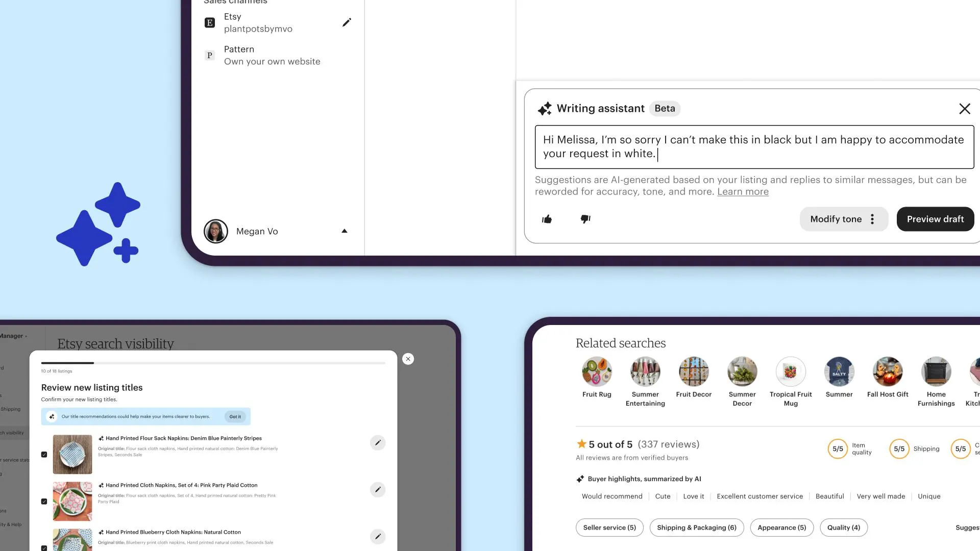 - Writing Assistant (Beta): Automatisierte Antwortvorschläge auf Käuferanfragen, die auf bisherigen Dialogen und Produktdetails basieren. Verkäufer:innen können die Texte anpassen oder selbst neu formulieren. Etsy-Daten zeigen: Verkäufer, die schneller antworten, erzielen bis zu 27 % höhere Conversion-Raten.
